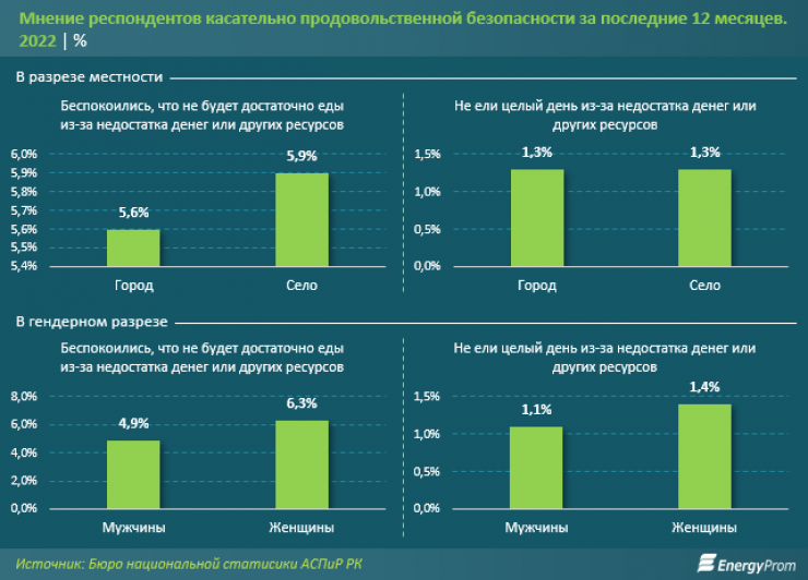 В городе беспокоятся о потенциальной нехватке средств на пищу больше, чем на селе (5,9 процента). В гендерном разрезе чаще беспокоиться приходится женщинам - 6,2 процента.
