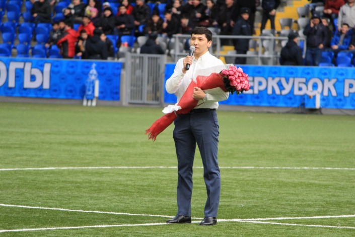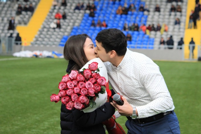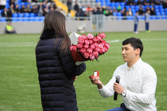 Как стало известно, героя, отважившегося на такой поступок, зовут Мухтар. В Международный женский день 8 Марта фанат футбола решил преподнести необычный сюрприз возлюбленной Диане. Он вышел с пышным букетом в центральный круг поля и предложил девушке выйти за него замуж, преклонив колено. Избранница ответила ему согласием, после чего он одел девушке на безымянный палец колечко.