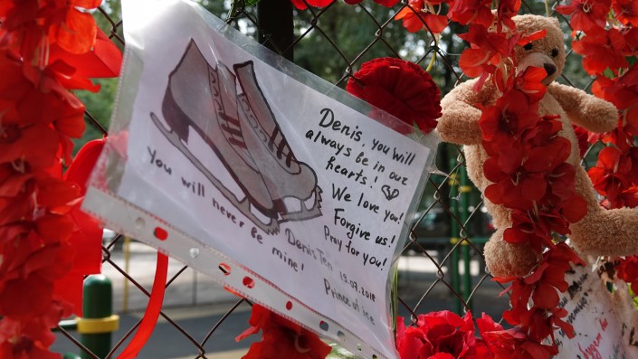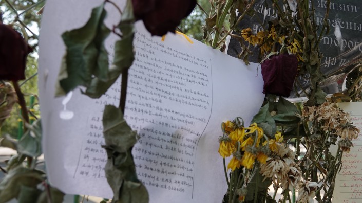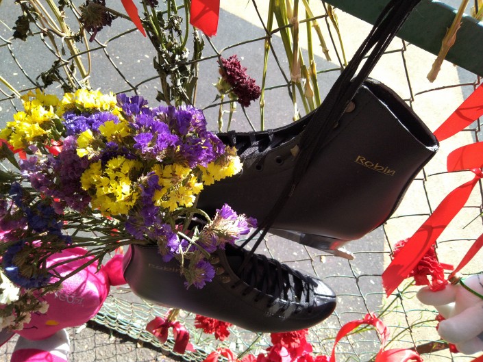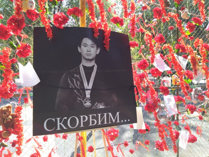 Кто-то в знак скорби повесил черные коньки, другие оставляют прощальные письма. Они написаны на русском, казахском, английском языках, встречаются и послания с иероглифами.