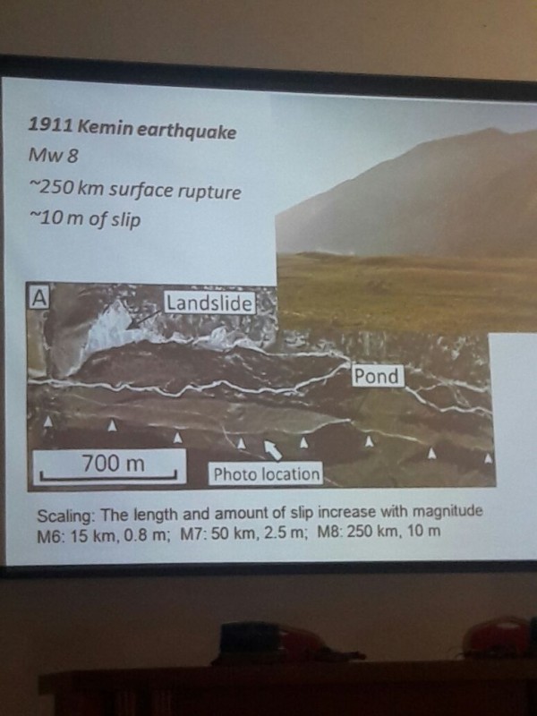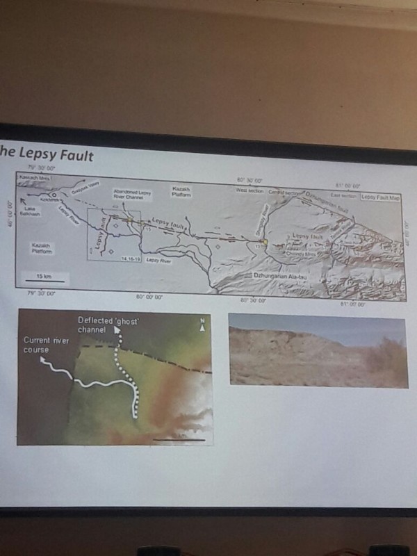 Он продемонстрировал собравшимся так называемый "Лепсинский разлом" недалеко от поселка Лепсы и гор Джунгарского Алатау. Сдвиг тектонических плит, по данным ученых, в этом случае составляет около десяти метров. "Когда произошло землетрясение, изменился канал реки Лепсы. Исследовав отложения в старом русле, нам удалось выяснить, что землетрясение произошло около 400 лет назад. Удивительно, но мы не видим никаких исторических записей о событии. Потенциально речь может идти о землетрясении 1716 года. В оригинальной исторической записи описаны разрушения в районе озер Балхаш и Зайсан, а также в городе Аксу в Китае. Но я не думаю, что это что-то, что мы можем сказать с абсолютной уверенностью", - пояснил ученый.