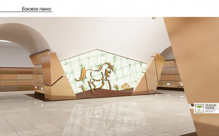 "Общий спокойный облик станции нарушают стильно вписанные четыре боковых панно. На них изображены символы степей, без которых просто невозможно представить себе Сарыарку. Это такие представители фауны, как сайгаки,  дрофа, косуля и так далее. Также на одном из панно изображен резвящийся конь на фоне стоянки кочевого народа, символом которого является юрта, показывая неразрывную связь кочевников с природой", - говорится в описании. Фон панно выполнен из оникса с подсветкой. Фигуры животных и предметы выполнены из латуни.