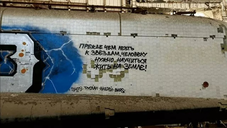 На корабле написали "Добро", "Юра, мы приехали", "Прежде чем лететь к звездам, человеку нужно научиться жить на Земле". Кроме того, на "Буране" оставлены четыре подписи - видимо, авторов граффити.