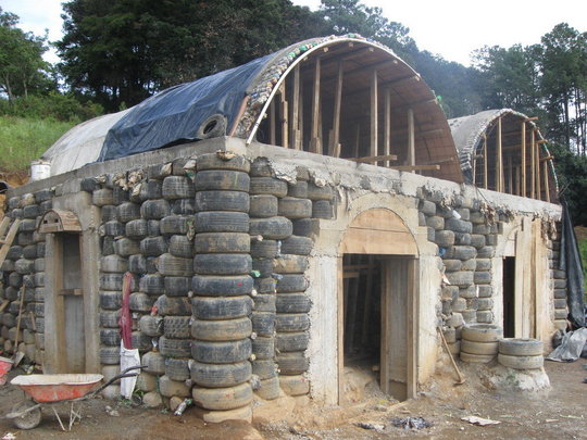 Автомобильные шины также иногда служат стройматериалом. Их ставят друг на друга, формируют периметр будущего дома, а после заполняют песком или землей. Стены получаются толстые - размером с диаметр окружности. На выходе строители-новаторы имеют теплое жилье с хорошей звукоизоляцией, однако очень пожароопасное и высокотоксичное. Жить в таких помещениях опасно для здоровья и жизни.