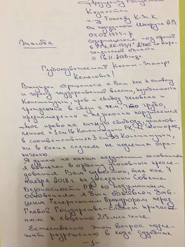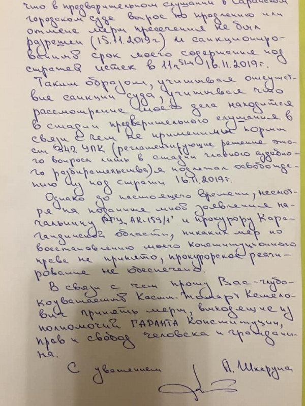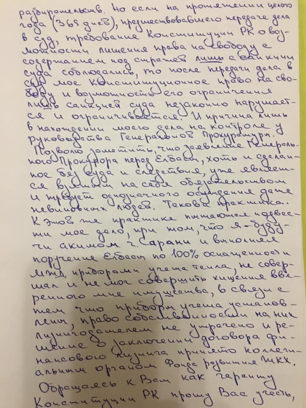 "Прошу вас учесть, в предварительном слушании в саранском городском суде вопрос по продлению или отмене меры пресечения не был разрешен (15 ноября 2019 года), и санкционированный срок моего содержания под стражей истек 16 ноября 2019 года. Таким образом, учитывая отсутствие санкции суда, учитывая, что рассмотрение моего дела находится на стадии предварительного слушания, в связи с чем неприменимы нормы статьи 342 УПК, я подлежал освобождению из-под стражи 16 ноября 2019 года. Однако до настоящего времени, несмотря на поданные мной заявления начальнику РГУ "АК-159/1" и прокурору Карагандинской области, никаких мер по восстановлению моего конституционного права не принято, прокурорское реагирование не обеспечено", - говорится в письме.