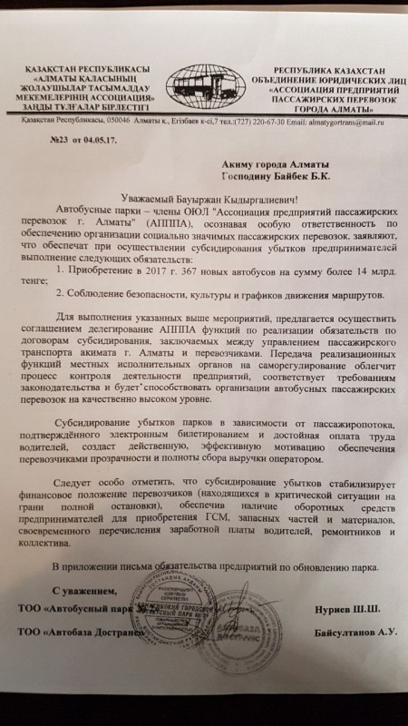 "Особо надо отметить, что бюджету в принципе не надо нести затраты на приобретение автобусов и создание парка, так как бизнес сам готов обеспечить выполнение этих задач. Об этом излагалось в письме акиму города, где перевозчики обязались в 2017 году при условии субсидирования убытков приобрести 367 автобусов на 14,6 миллиарда тенге. Также взяты обязательства, что будут обеспечены безопасность движения, культура и качество обслуживания пассажиров", - отмечается в обращении.