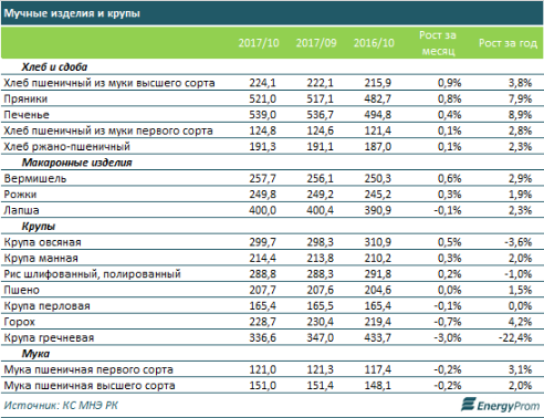 В сегменте мучных изделий и круп значительного роста цен не отмечено (не более чем на 1 процент). Заметное удешевление зафиксировано только для гречневой крупы - сразу минус 3 процента к сентябрю, до 336,6 тенге за килограмм.