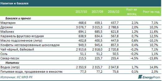 Среди продуктов бакалеи более чем на 1 процент подорожали к сентябрю только маргарин (плюс 2,1 процента за месяц, до 468,6 тенге), дрожжи (плюс 2 процента, до 3,1 тысячи тенге за килограмм) и майонез (плюс 1,2 процента, до 694,1 тенге).