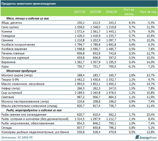 По итогам октября 2017 года наиболее заметно среди всей продукции животного происхождения выросли в цене яйца - на 8,3 процента за месяц, до 230,2 тенге за десяток, приводятся данные в исследовании. Прочие продукты в сегменте мяса, птицы и изделий из них подорожали к сентябрю на более чем 1 процент.