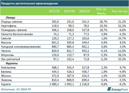 Из фруктов сильнее всего выросли в цене привозные: апельсины (плюс 2,3 процента за месяц, до 568,1 тенге) и бананы (плюс 1,9 процента к сентябрю, до 434,5 тенге за килограмм).
