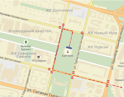 Движение будет временно ограничено по улице Кунаева (от улицы Туркестан до улицы Акмешит), по улице Акмешит (от улицы Кунаева до улицы Достык), по улице Достык (от улицы Акмешит до улицы Орынбор включительно).