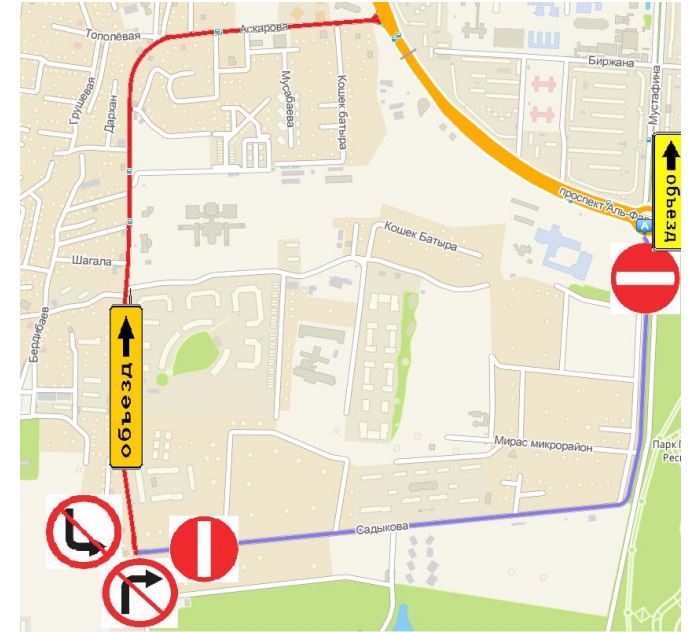 "Кроме того, в связи с укладкой асфальтобетонного покрытия по улице Мустафина (Садыкова), от улицы Аскарова до проспекта Аль-Фараби, движение транспортных средств будет перекрыто с 12 по 15 апреля текущего года. Движение будет временно организовано по улице Аскарова", - сообщили в городской администрации.