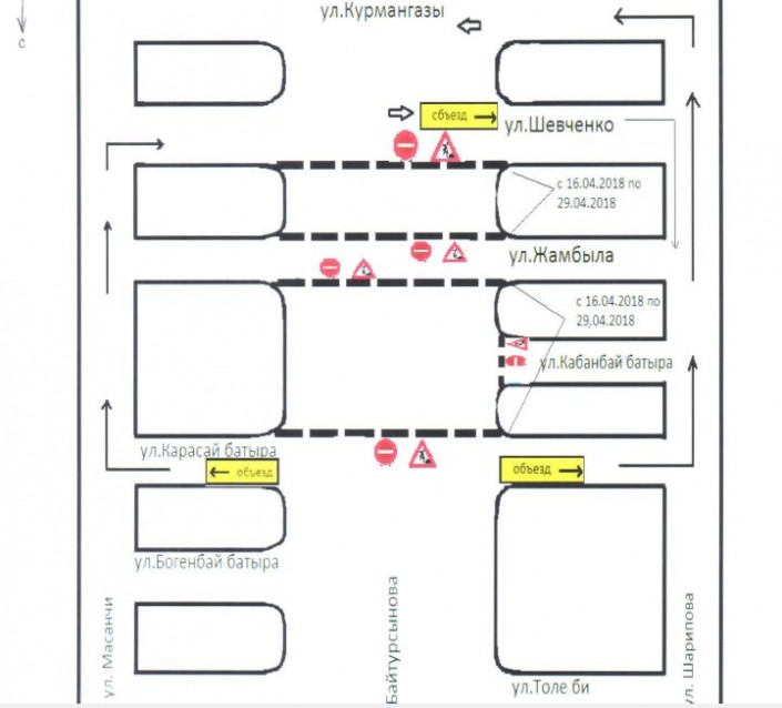 На улице Байтурсынова, от улицы Шевченко до улицы Карасай батыра, движение будет перекрыто с 16 по 29 апреля текущего года.