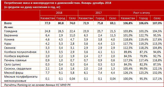 Потребление домохозяйствами мяса и мясопродуктов за год выросло на 6,8 процента (в городах на 6,6 процента, в селах - на 7 процентов) и составило в 2018 году 77,9 килограмма в среднем на душу населения. Из них все большей популярностью пользуются конина (рост за год на 18,6 процента, до 4,6 килограмма) и куры (плюс 17,7 процента год к году, до 4,2 килограмма).