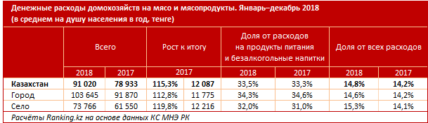 Денежные расходы домохозяйств на мясо и мясопродукты в 2018 году составили 91 тысячу тенге в среднем на душу населения - на 15,3 процента больше, в 2017 году. В сельской местности расходы на мясо и мясопродукты выросли заметнее: на 19,8 процента, до 73,8 тысячи тенге. В городах рост составил 12,8 процента, до 103,6 тысячи тенге.