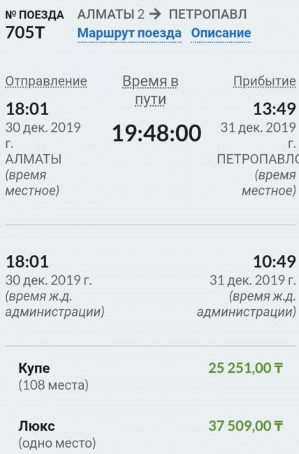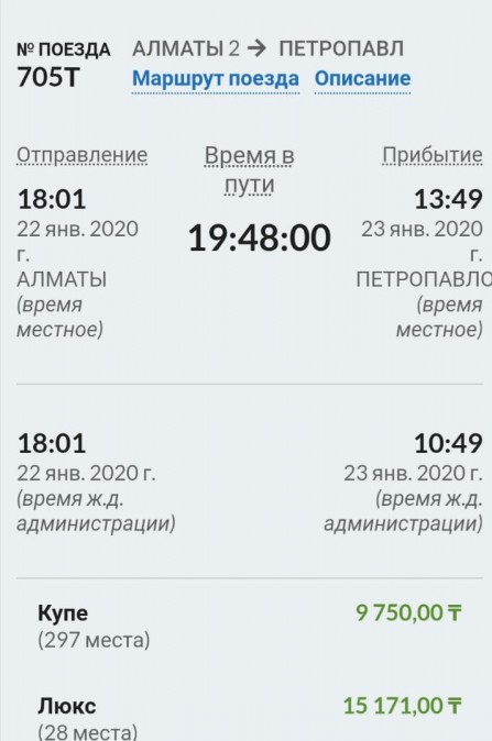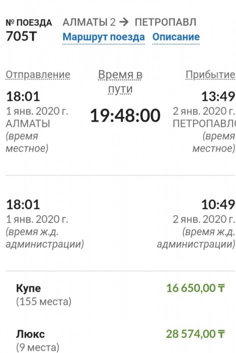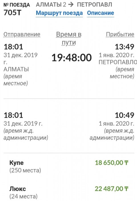В редакцию портала обратился алматинец Мурат Алиев. Мужчина сравнил цены на билеты на новогодние выходные на сайте "Пассажирских перевозок" Bilet.railways.kz. Он обратил внимание на стоимость билета на поезд номер 705Т сообщением Алматы-2 - Петропавловск. Проездной в купе на 30 декабря стоил 25 251 тенге, на 31 декабря - 18 650 тенге, на 1 января - 16 650 тенге, на 22 января - 9 750 тенге. При этом билет он намеревался купить за месяц до поездки, справедливо надеясь, что сумма должна быть небольшой.