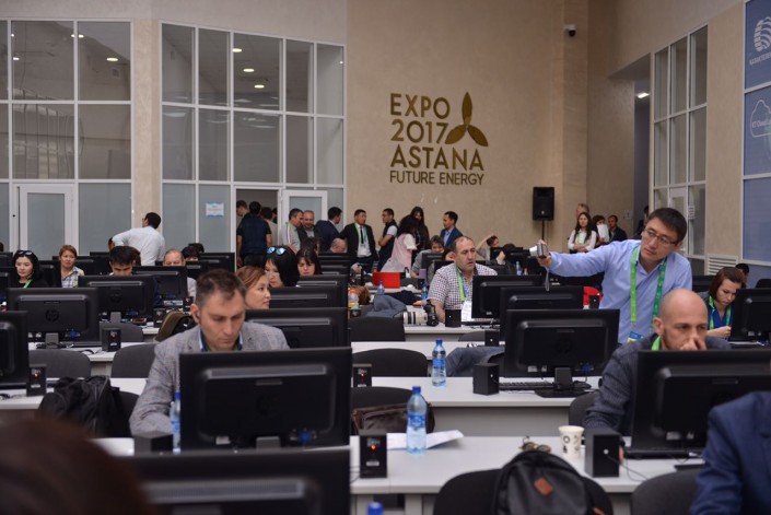 18.23 Журналисты собрались в медиацентре. Представители иностранных и отечественных СМИ готовятся к церемонии открытия. На выставку аккредитовано около 1200 журналистов.