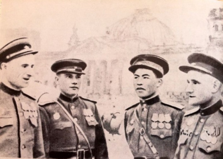 У поверженного Рейхстага. Слева направо: Мелитон Кантария, Михаил Егоров, Рахимжан Кошкарбаев и Степан Неустроев