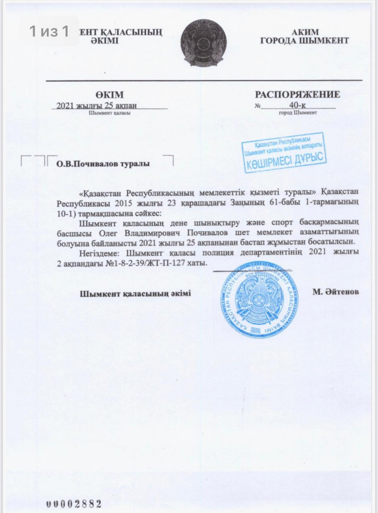 Сообщается, что приказом акима Шымкента Мурата Айтенова руководитель Управления физической культуры и спорта Олег Почивалов был освобожден от должности. В акимате показали копию документа.