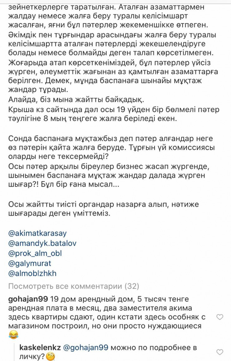 Кроме того, в комментариях пользователи написали, что в этом доме якобы "сдают квартиры замакимы". В акимате также прокомментировали этот слух.