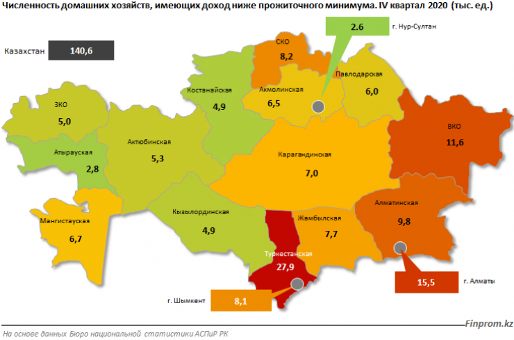 Больше всего семей с доходом ниже прожиточного минимума проживает в Туркестанской области - 19,9 процента, или 27,9 тысячи домохозяйств. Тем не менее за год число таких семей в регионе уменьшилось на 12,2 процента за год. Тут также была зафиксирована и наибольшая доля населения, проживающего за чертой бедности, - 10,3 процента. А средний показатель по стране составил 4,6 процента (годом ранее - 3,8).