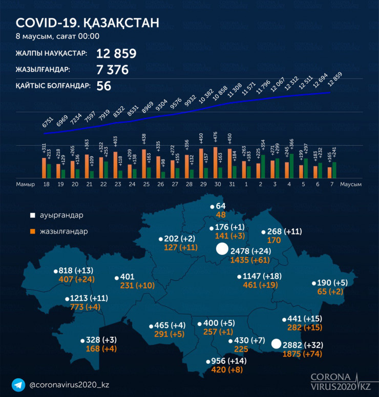 За прошедшие сутки (7 июня) в Казахстане выявлено 165 заболевших коронавирусной инфекцией, передает Tengrinews.kz.