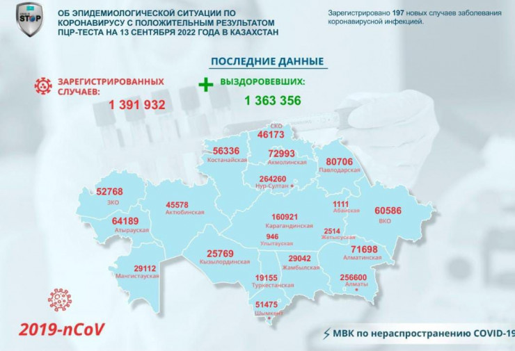 В Казахстане за прошедшие сутки (13 сентября) зарегистрировано 197 новых случаев заболевания коронавирусной инфекцией, передает корреспондент Tengrinews.kz со ссылкой на МВК по нераспространению COVID-19.