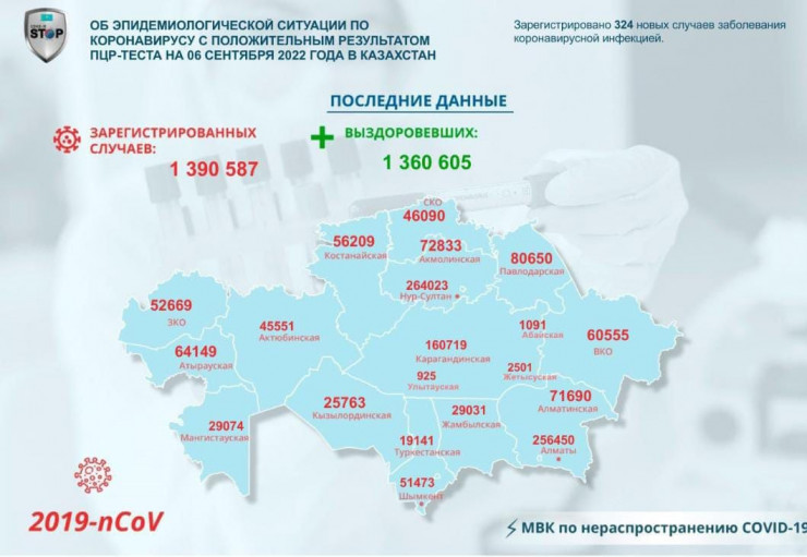 В Казахстане за прошедшие сутки (6 сентября) зарегистрировано 324 новых случая заболевания коронавирусной инфекцией, передает Tengrinews.kz со ссылкой на МВК по нераспространению COVID-19.