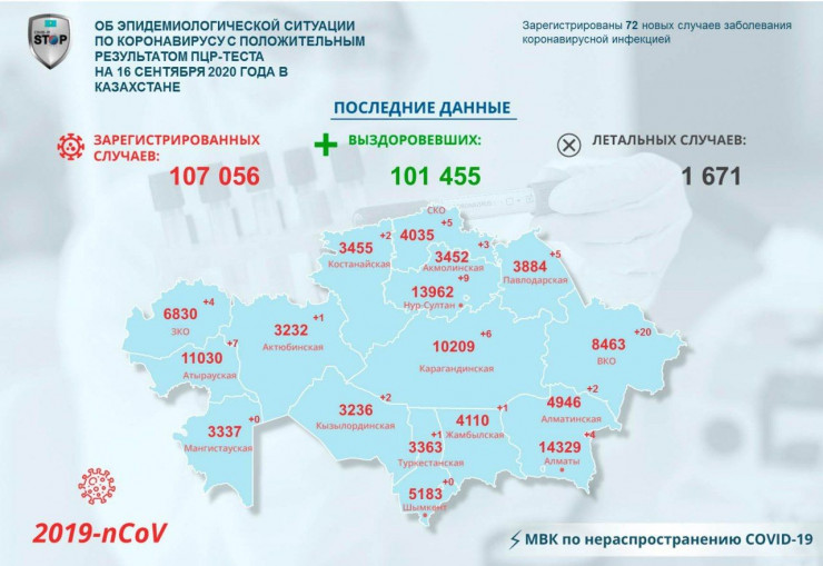 За прошедшие сутки (по данным на 16 сентября) в Казахстане зарегистрированы 72 новых случая заболевания коронавирусной инфекцией, сообщает Tengrinews.kz со ссылкой на МВК по нераспространению COVID-19.