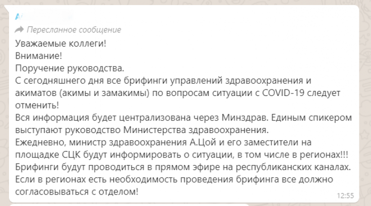 В то же время в WhatsApp появилась рассылка, в которой сообщается о том, что якобы Министерство здравоохранения запретило региональным акиматам и управлениям оперативно сообщать о ситуации.