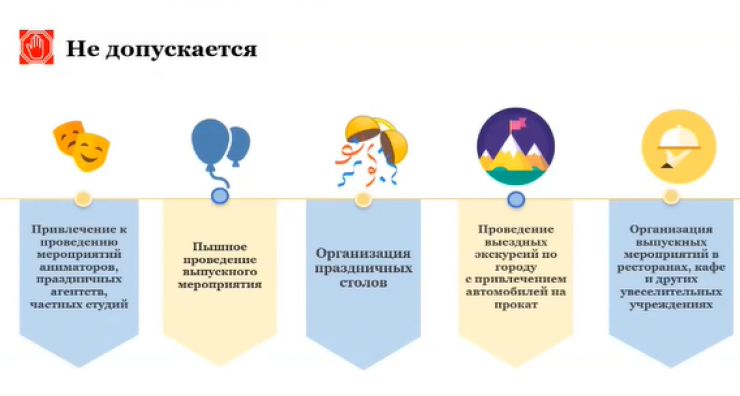На выпускные нельзя приглашать аниматоров, сотрудников праздничных агентств, частных студий. Также под запретом пышные праздники, застолья.