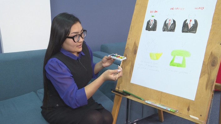 "Мы рисуем трех мужчин в пиджаках, это государственные служащие. У одного купюра на глазах - это говорит о том, что он не хочет видеть в стране коррупцию, у второго в ушах две купюры, это означает, что он не хочет слышать про взятку, и рот у него тоже закрыт купюрой - то есть он не будет говорить о взятке", - пояснила свой рисунок участница акции Самал Ануарбекова.
