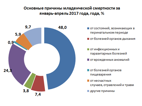 За январь-апрель 2017 года в республике зарегистрировано 1054 умерших младенцев в возрасте до 1 года. По сравнению с соответствующим периодом предыдущего года число умерших детей в возрасте до 1 года уменьшилось на 24,5 процента.