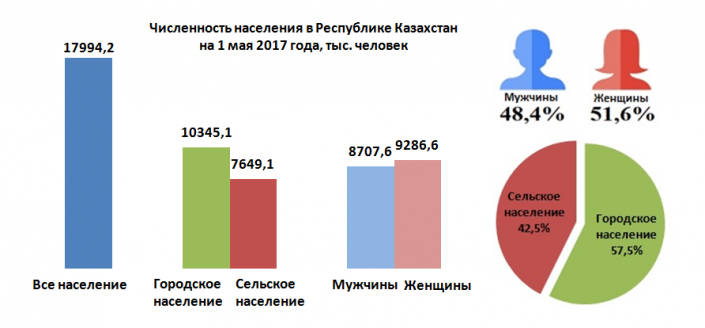 Численность населения страны на 1 мая 2017 года составила 17 994,2 тысячи человек, в том числе городского – 10 345,1 тысячи человек (57,5 процента), сельского – 7 649,1 тысячи человек (42,5 процента). По сравнению с 1 мая 2016 года численность населения увеличилась на 241,1 тысячи человек, или 1,4 процента.