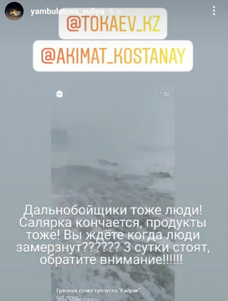 "Мой отец начал подъезжать к границе 22 февраля, и начинался буран, было обеденное время. мы думали, он сумеет проскочить и доедет до дома, но на границе его не пустили. Машин было очень много, от российской таможни до светофора на Троицк. Ели то, что было у водителей с собой. Деньги есть, он не может купить, еда и топливо на исходе. У папы вчера еда закончилась, сегодня с ним обед разделил коллега", - рассказала дочь водителя Юлия Карпенко.