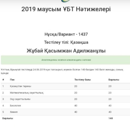 "9-сыныптан бастап биология, химия пәндерін бейінді оқи бастадым. ҰБТ-да мақсатым 140 балл жинау болды. Қорыққаным жоқ. Мен үшін барлық пән бірдей жеңіл болды. Әсіресе Қазақстан тарихы, себебі анашым мектепте осы пәннен сабақ береді. Жақсы дайындалдым. Тестілеуде соңына дейін отырдым, жауаптарымды қайтара тексеріп үлгермедім. Сұрақтардың барлығы мектеп оқулығынан келді. Тестілеуден кем дегенде 135 балл жинаймын деп ойладым, нақты қанша екенін білмедім. Үйге келген соң есімде қалған, күмәнданған сұрақтарды кітаптан қарадым", - дейді ол.