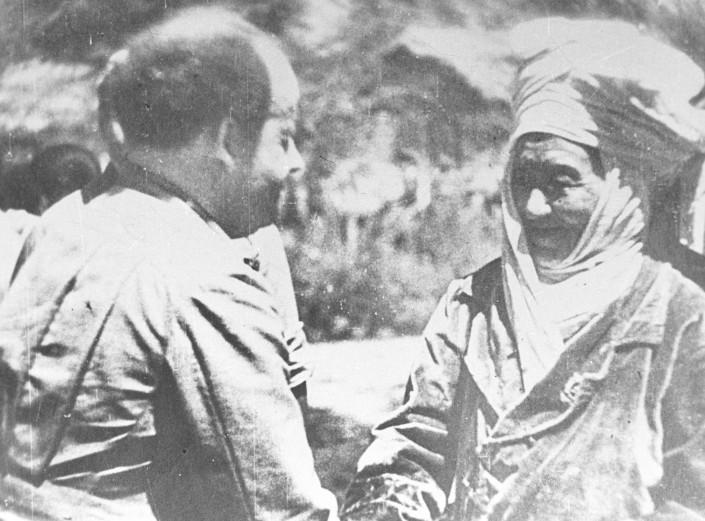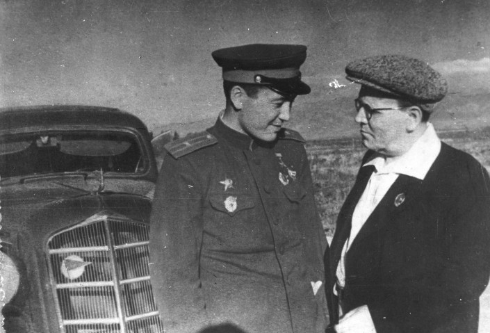 Самуил Маршак во время встречи с Героем Советского Союза Маликом Габдуллиным. Казахстан, 1944 год.
