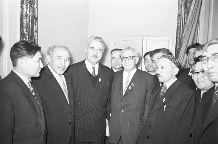 Киносценарист Константин Симонов (справа крайний), среди участников конференции писателей стран Азии и Африки. Писатель Габит Мусрепов (слева второй). Ташкент, 1958 год.