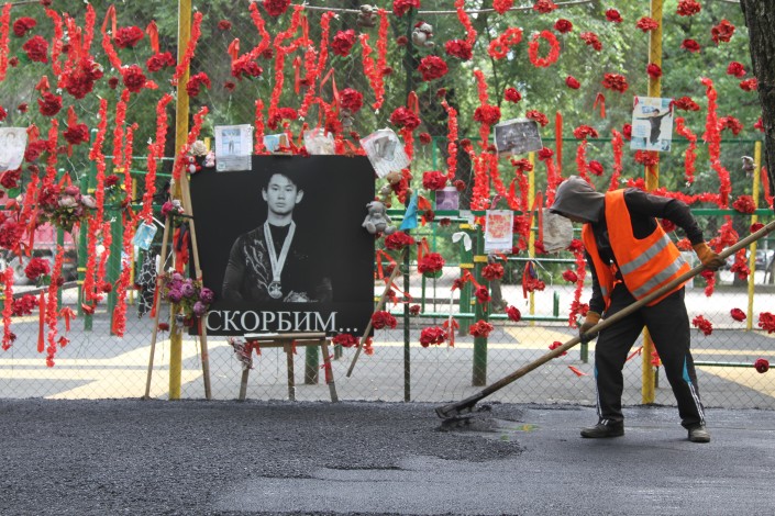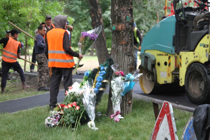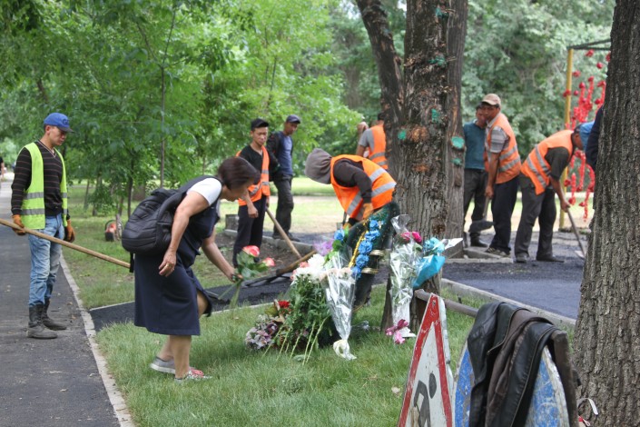 Букеты цветов и венки жители и гости города несут на пересечение улиц Курмангазы и Байсеитовой, в центре Алматы, складывают у дерева. Многие подолгу стоят возле места, скорбят.