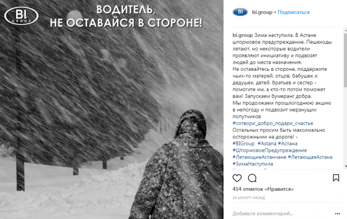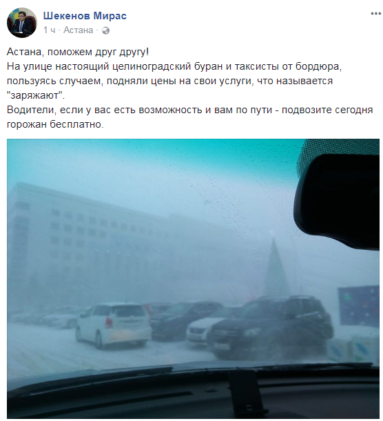 "Астана, поможем друг другу! На улице настоящий целиноградский буран и таксисты от бордюра, пользуясь случаем, подняли цены на свои услуги, что называется "заряжают". Водители, если у вас есть возможность и вам по пути, подвозите сегодня горожан бесплатно", - написал Мирас Шекенов.
