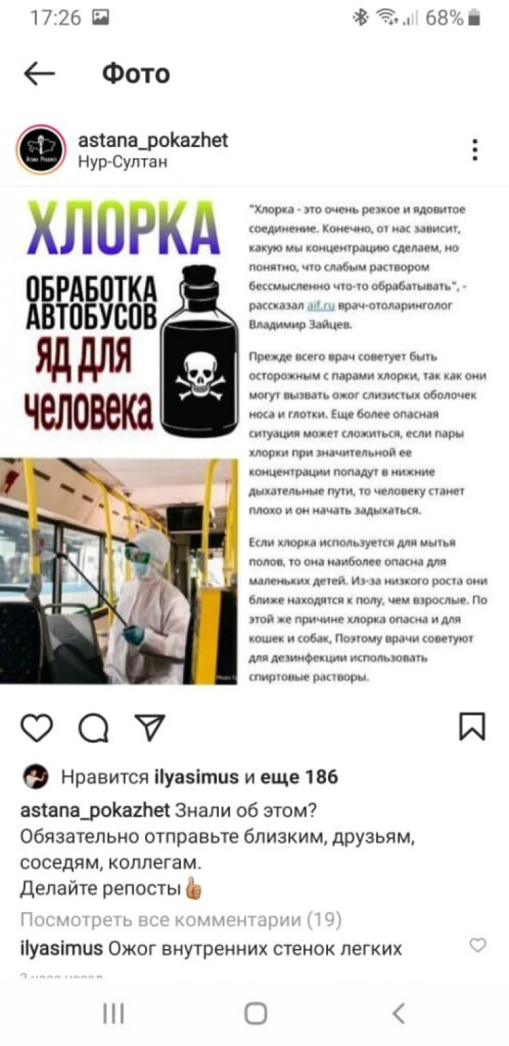 Казахстанцы в очередной раз высказываются против санитарной обработки общественного транспорта. Некоторые пользователи Сети считают, что вещества, применяемые для дезинфекции, очень ядовиты и представляют опасность для жизни и здоровья, передает Tengrinews.kz со ссылкой на Stopfake.kz.