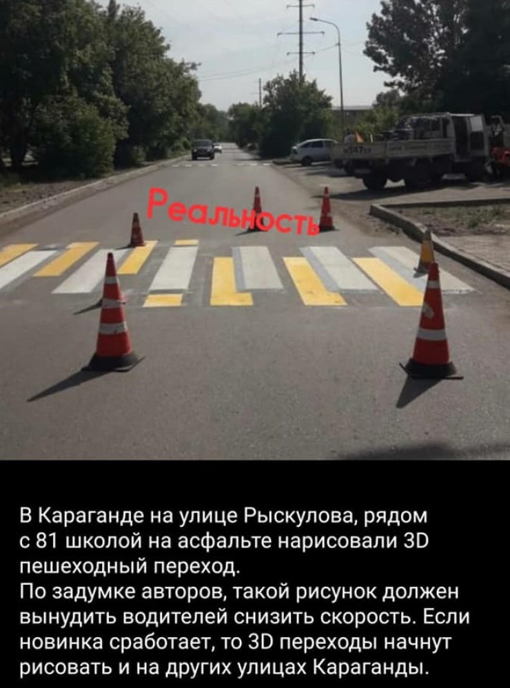 "Дорожная разметка "пешеходный переход 3D" на улице Рыскулова в районе средней школы № 81 была согласована и нанесена экспериментально. Однако она была нанесена неправильно. Подобная дорожная разметка ранее применялась в СКО и ЮКО", — сообщили в пресс-службе ДП Карагандинской области.