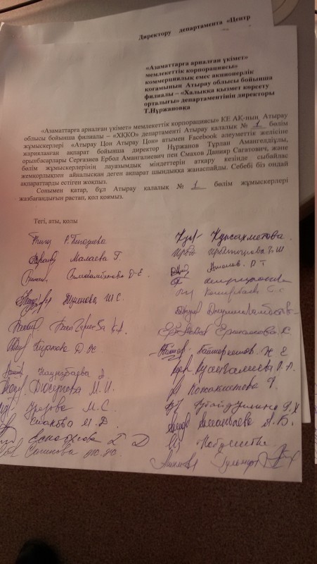 "Мы, работники ЦОН Атырауской области обращаемся к Вам с просьбой восстановить справедливость и дать возможность спокойно работать ЦОНу Атырауской области. У директора ЦОНа Нуржанова Турлана Амангельдиевича открыта частная лавка, которая обеспечивает его безбедную жизнь. Он через своих подставных лиц, состоящих из его близких и дальних родственников, которые находятся в каждом направлении государственной услуги (накопительный, паспортный, кадровый отделы, бухгалтерия), получает взятки за оказание услуг", - говорится в письме, которое распространяют в соцсетях и через WhatsApp.