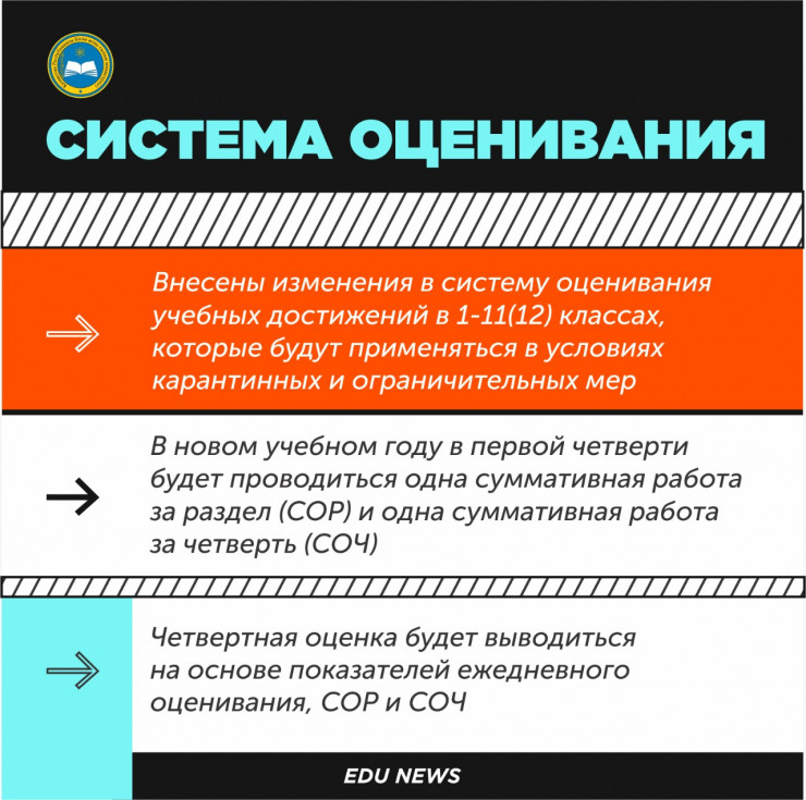 "В новом учебном году в первой четверти будет проводиться одна суммативная работа за раздел (СОР) и одна суммативная работа за четверть (СОЧ). Четвертная оценка будет выводиться на основе показателей ежедневного оценивания, СОР и СОЧ", - пояснили в ведомстве.