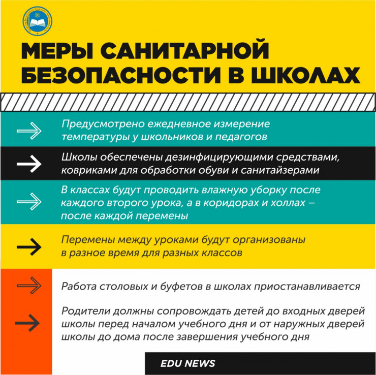 "Чтобы избежать скопления, необходимо будет четко разграничить время прихода в школу разных классов и выхода из нее. Также назначить дежурных лиц для встречи и сопровождения детей. Во всех школах нужно регулярно проводить тщательную уборку с применением дезинфицирующих средств. По каждому классу должен быть акт готовности. Необходимо организовать фильтры, при входе в здание установить тепловизоры, дезинфицирующие тоннели, коврики, то есть все необходимое по санитарному режиму. Все регионы знают, поручения даны", - сказал Ералы Тугжанов.