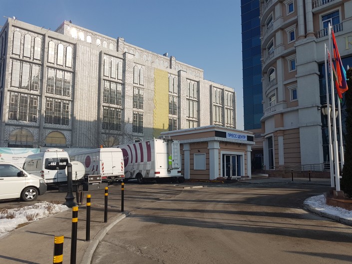 Также возле отеля организовали пресс-центр. Рядом с ним стоят передвижные телевизионные станции.