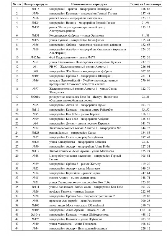 Список маршрутов. Таблица с сайта маслихата Алматы