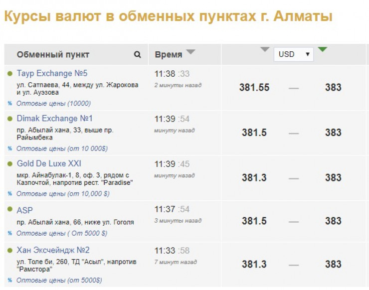 Доллар в обменниках Алматы и Нур-Султана продают по 382-383 тенге. Днем ранее доллар продавался за 379-381,5 тенге.