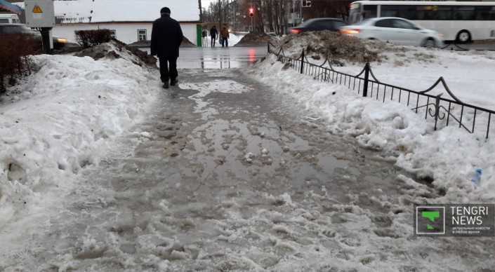 Третьи сутки талые воды разливаются по дорогам и тротуарам областного центра ЗКО, сообщает корреспондент Tengrinews.kz.
