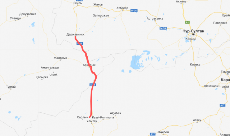 - Жезказган - Петропавловск, километры 340-377, участок от Аркалыка до границы Акмолинской области.