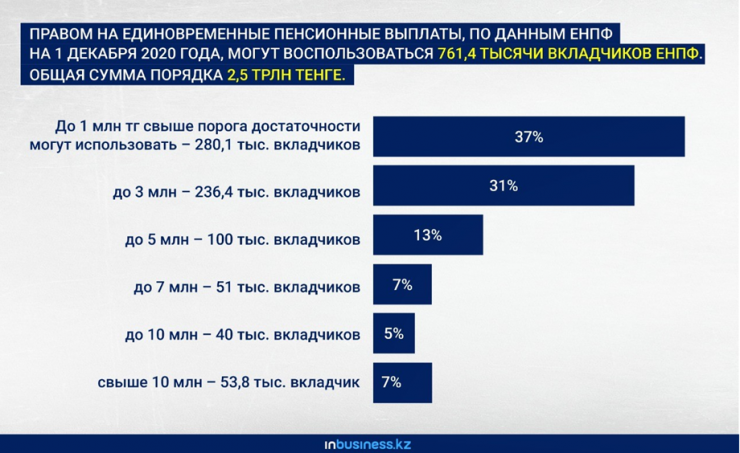 Объем пенсионных активов, аккумулированных в АО "Единый накопительный пенсионный фонд", в декабре вырос на 193 миллиарда, до 12,913 триллиона тенге. Ранее в ЕНПФ заявляли, что на 1 декабря 2020 года объем доступных к изъятию средств составлял 2,5 триллиона из 12,72 триллиона тенге, которые предполагалось распределить между 761,4 тысячи вкладчиков фонда. С ростом пенсионных активов объем доступных к изъятию "излишков" стал больше, а вот насколько – вопрос открытый.